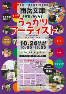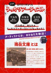 雨岳文庫 251006 貴方もうっかりアーティストになりましょう! 2025年10月6日 h-tanaka コメントする 10月3日に雨岳文庫主催のイベント「秋の雨岳文庫を楽しもう!」を紹介しましたが、最初のイベント「古民家で貴方もうっかりアーティスト」が10月26日(日)に始まります。春4月には140人の方々がご家族で参加され思い思いの時間を過ごされました。 とても楽しい催しですので、更に詳しいチラシを紹介します。 チラシの裏面です。 是非ご家族や親しい方と連れ立って参加ください。 Total Page Visits: 13 - Today Page Visits: 1