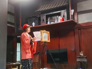 ▼南側のテラスでは地元の昔話の紙芝居が演じられました。
