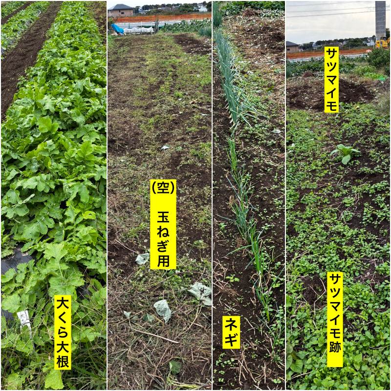 大くら大根→(空)玉ねぎ用→ネギ→サツマイモ(手前収穫済み奥収穫前)→