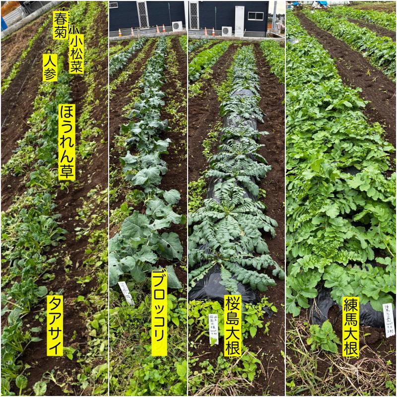 手前タアサイ、奥にほうれん草・人参・小松菜・春菊(本日種まき)→ブロッコリ→桜島大根→練馬大根→