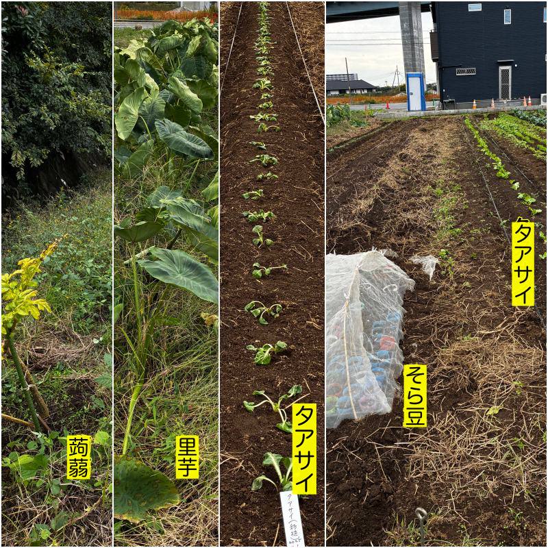 西富岡の畑11月1日現在。牛舎を背中にして東側から見たところです。蒟蒻→里芋→タアサイ(本日植替え)→そら豆(ポット)→タアサイ