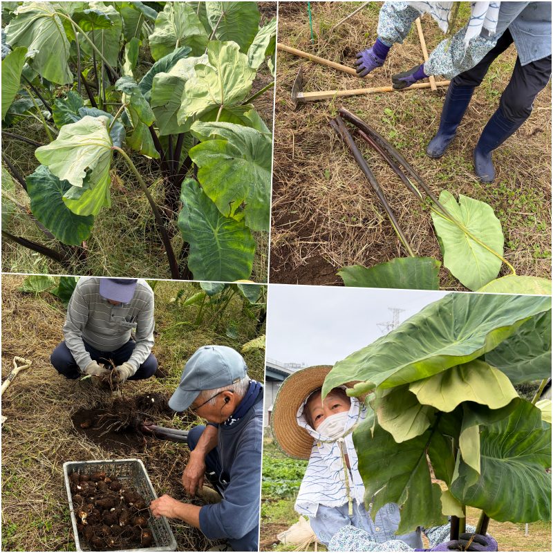 ミッション[3] 里芋の収穫です。この畑の里芋は親芋・小芋・孫芋と代々受け継がれていています。ご近所のプロ農家さんの葉っぱより、見た目がいいのが自慢です。(お味も抜群です)