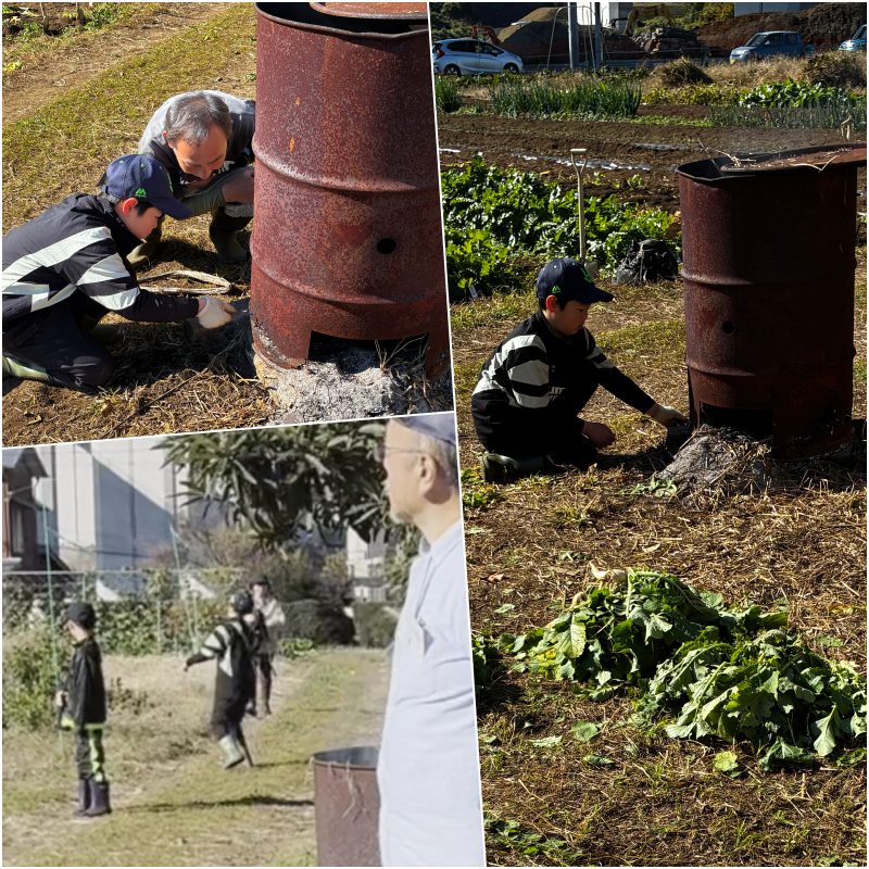 本日も小学生兄弟の体験家族が来てくれました。黙々と煙の出るドラム缶の焼却炉に興味津々でした。IHが普及してきて裸火に触れる機会は貴重のようでした。