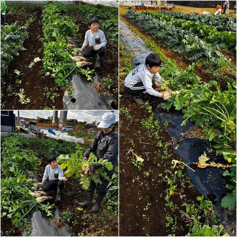 青首大根と源助大根の収穫です。「大根抜き」は“うんとこしょ・どっこいしょ”の掛け声で遊びの名称になっているほどですので、大人も子どもも本物の畑での「大根抜き」は魅力的です。