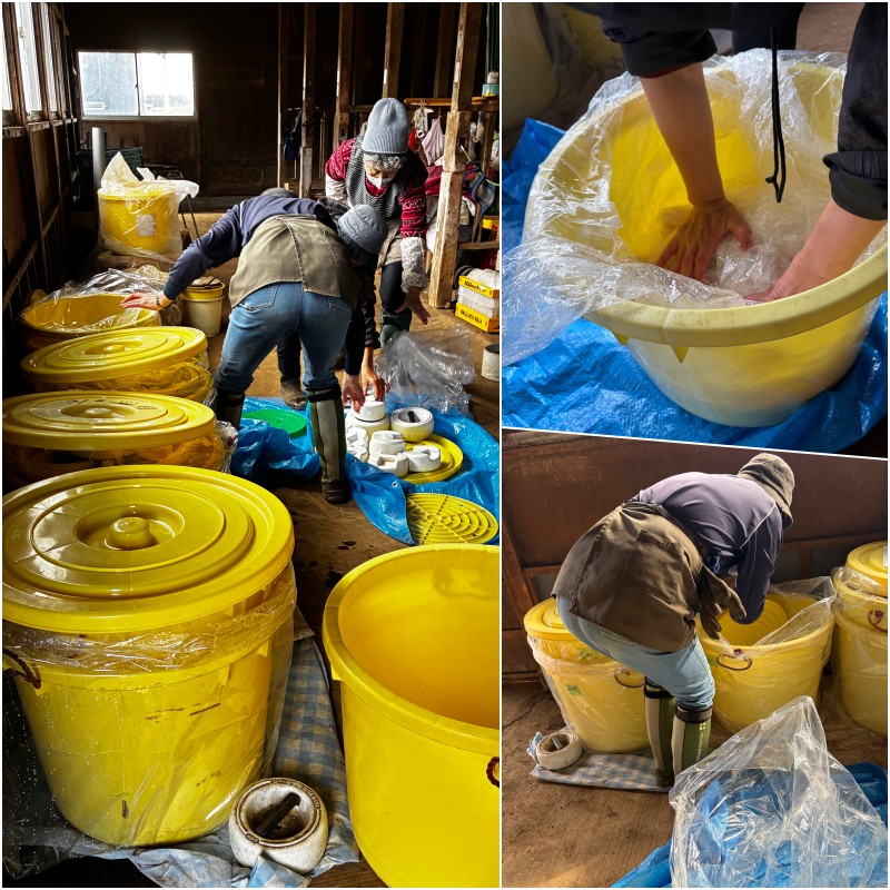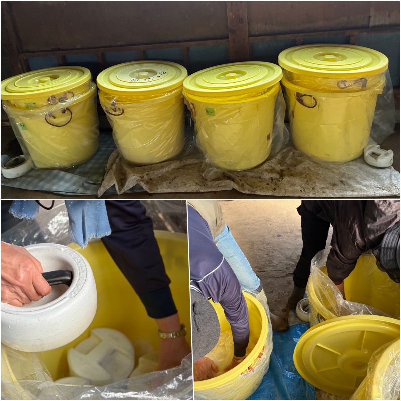 自然の会恒例の加工大根の漬け込みが始まっています。塩漬け1週間が経過しました。水揚げのチェックと重りの再調整を行います。もう1週間塩漬けのまま過ごしてもらいます。