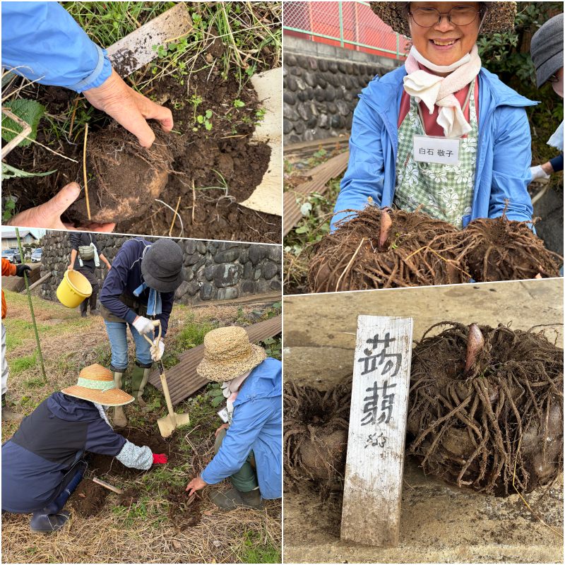 今年の夏に「悪魔の舌」と呼ばれ少々独自の花を咲かせたこんにゃくの芋を掘り起こしてみました。こんにゃくはよく知られた食品ですがこんにゃく芋を知っている方は少ないかもしれません。こんにゃく作り大好きな会員がいますので手作りこんにゃくを作ってもらいましょう。