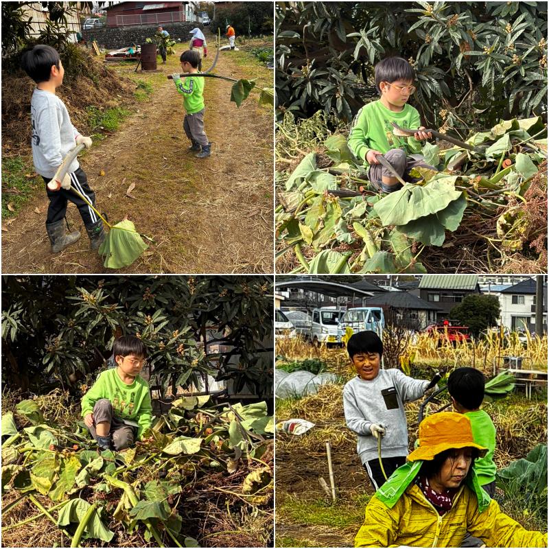 里芋の茎はチャンバラごっこの刀になって、広い畑で走り回ることができます。小高く積まれた堆肥場はお山の大将気分も味わえるようです。