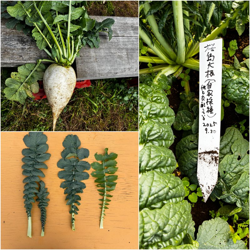 昨年(令和6年)個人の畑で自家採取した桜島大根ができました。青首大根と桜島大根のハーフのようで、形も「ハーフ」に見えます。葉っぱ写真、左から桜島大根・自家受粉大根・青首大根とやはりハーフに見えますね。