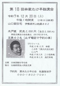 雨岳文庫 251206 林家たけ平落語独演会が近づきました 2025年12月6日 h-tanaka コメントする 雨岳文庫山口家住宅で開催される年末恒例の林家たけ平師匠の落語独演会が、2週間後の12月20日(土)となりました。 年末の慌ただしい中ですが、築190年の古民家で語られるたけ平師匠の人情味あふれる噺に浸られたら如何でしょうか! Total Page Visits: 8 - Today Page Visits: 8