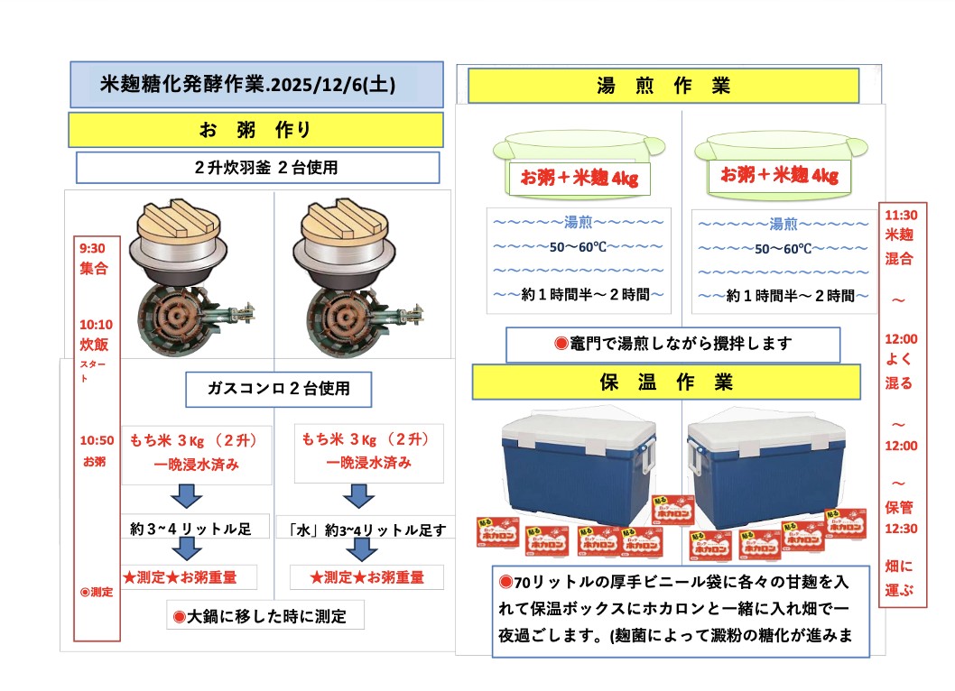 ◉配合比:餅米3Kg(1晩浸水後7.6Kg)+水6ℓ(お粥状にするため)、米麹4Kg=甘麹15.8Kg 2セット作製しました。保温箱に入れ、携帯カイロで発酵適温をキープしつつ1晩畑で寝かします。