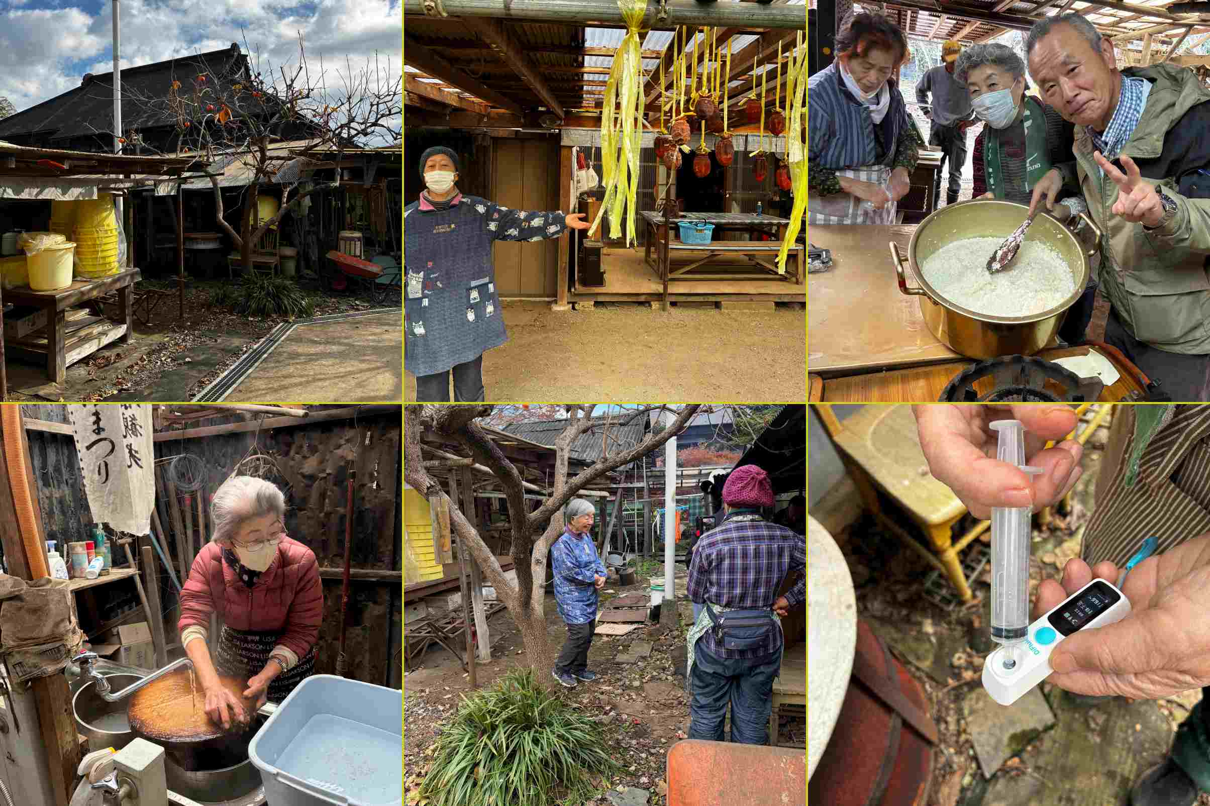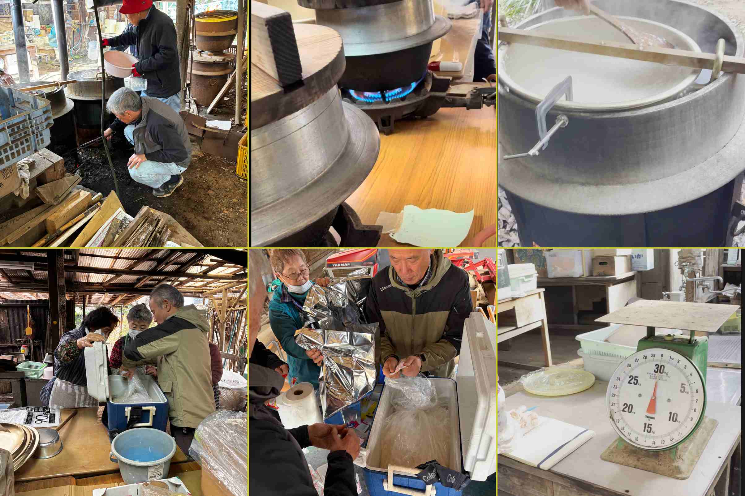 雨岳文庫さんでは、9時半に山口邸に集合しました。もち米をお粥状に羽釜で炊き上げ、鍋温度を60°Cにキープしながら、米麹を混ぜて発酵作業を行います。べったら作りが10年目になり、なんとか流れを習得してきたように思えます。が、この安心感で気を抜くと思わぬ落とし穴があるのも微生物の世界なので、緊張感を持って今年も挑みました。