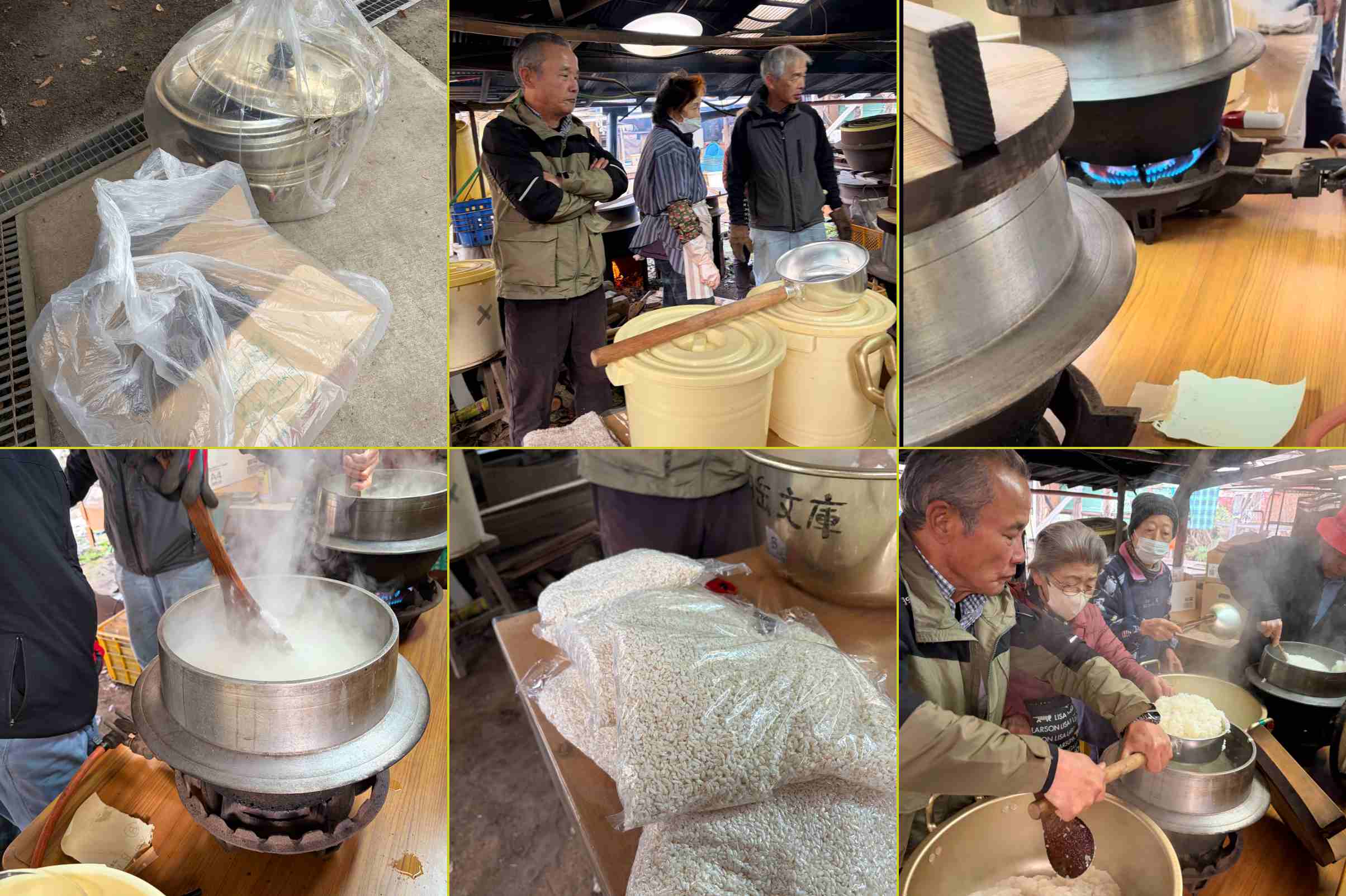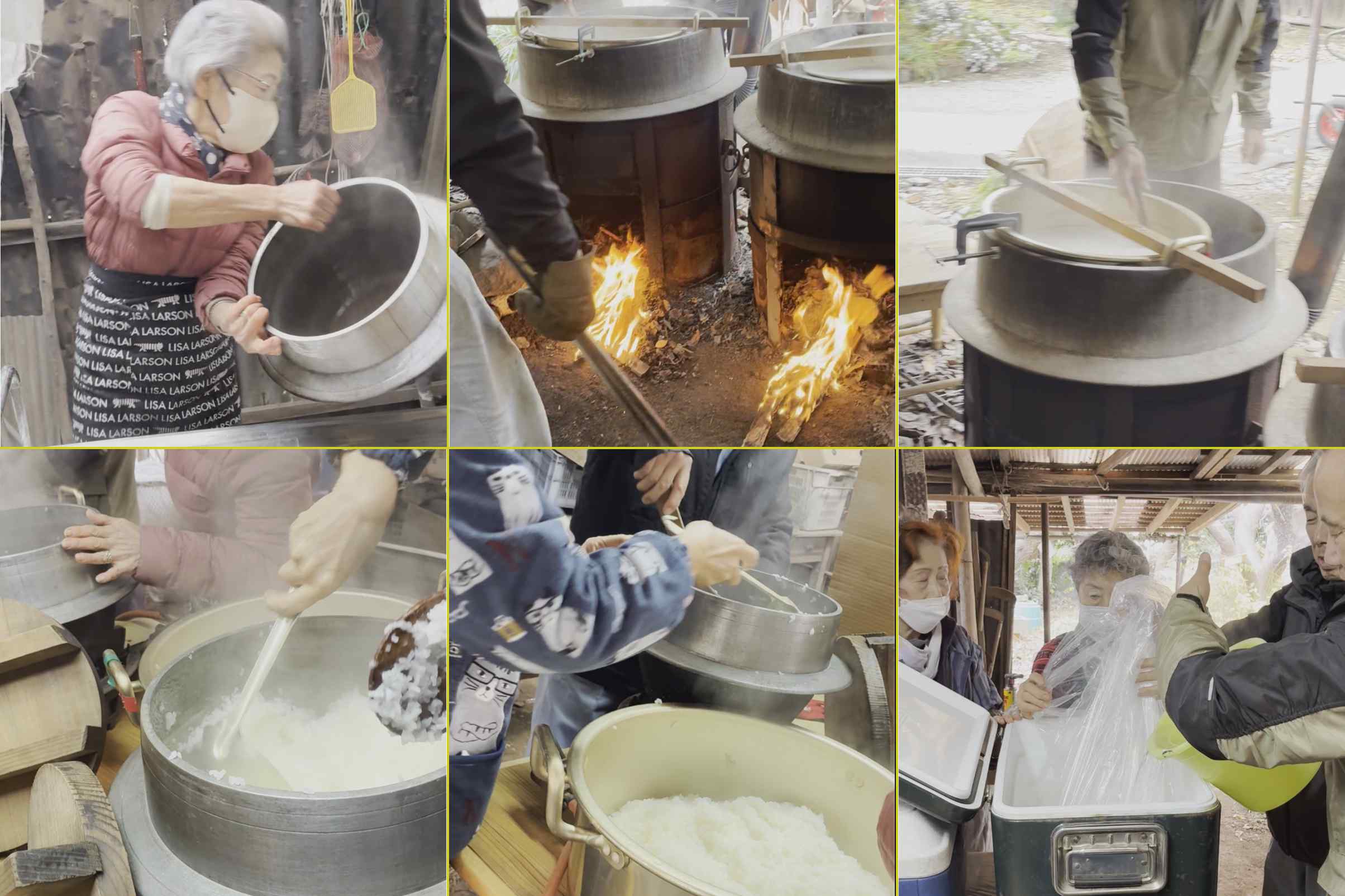 羽釜、大鍋、ガスコンロ、備品、そして竈門かまどをお借りしての作業です。米麹は伊勢原の柏木菊江さんの手作り品を今年もお願いできました。