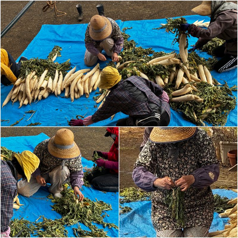 大根を縛っていた麻縄を解いています。ビニールテープで結んでいたときは乾くにつれて落ちてしまう大根がありましたが麻縄ではこの現象はありませんでした。