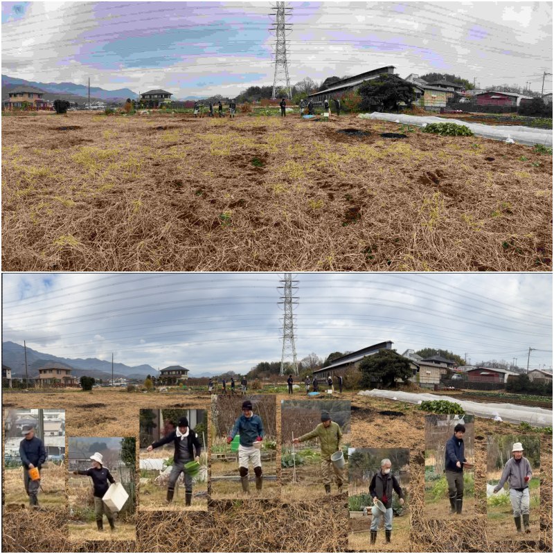 この広大な畑に菜の花の種を蒔きました。花咲け農フたちが一斉に蒔き始め、瞬時に終わりました。