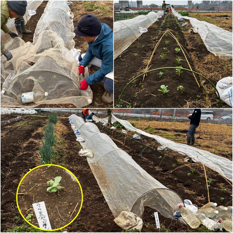 そら豆は栽培期間がとても長い植物です。11月に蒔いて5月頃に収穫です。冬場の霜除のためにネットを貼りました。