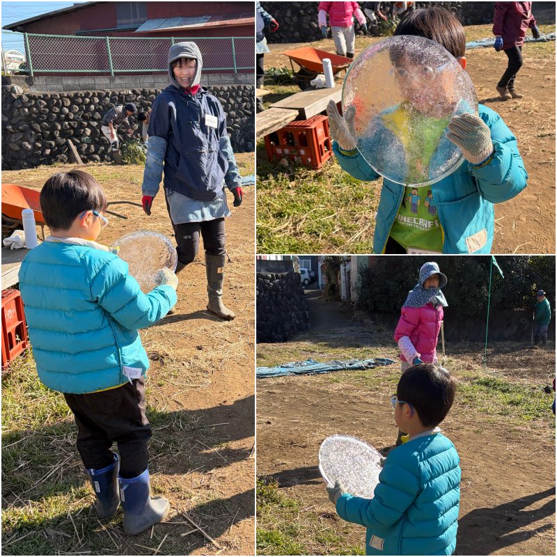 厚い氷がこの春1年生の遊びのツールになっています。昔、子どもだった大人たちも氷遊びが懐かしく、思わず声をかけてます。