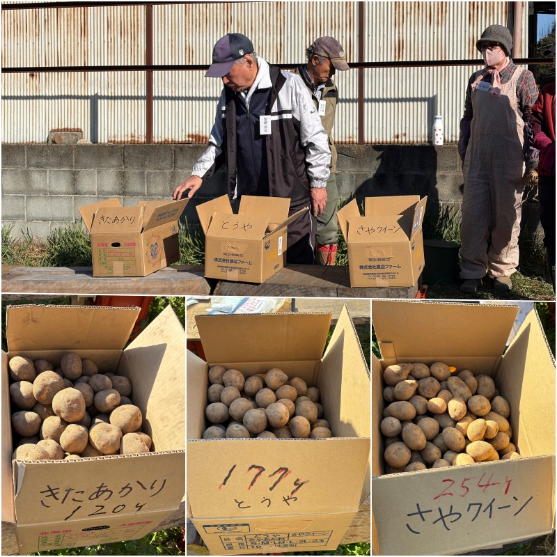 今年はこの3種類です。キタアカリ120ヶ、トウヤ177ヶ、さやクィーン254ヶ、合計551ヶでした。昨年はキタアカリ164個、トウヤ286個、サヤクイーン190、合計640個で、畝数はトウヤを3畝、他を2畝で合計7畝作りました。今年はまだ畝の数は決まってないようです。
