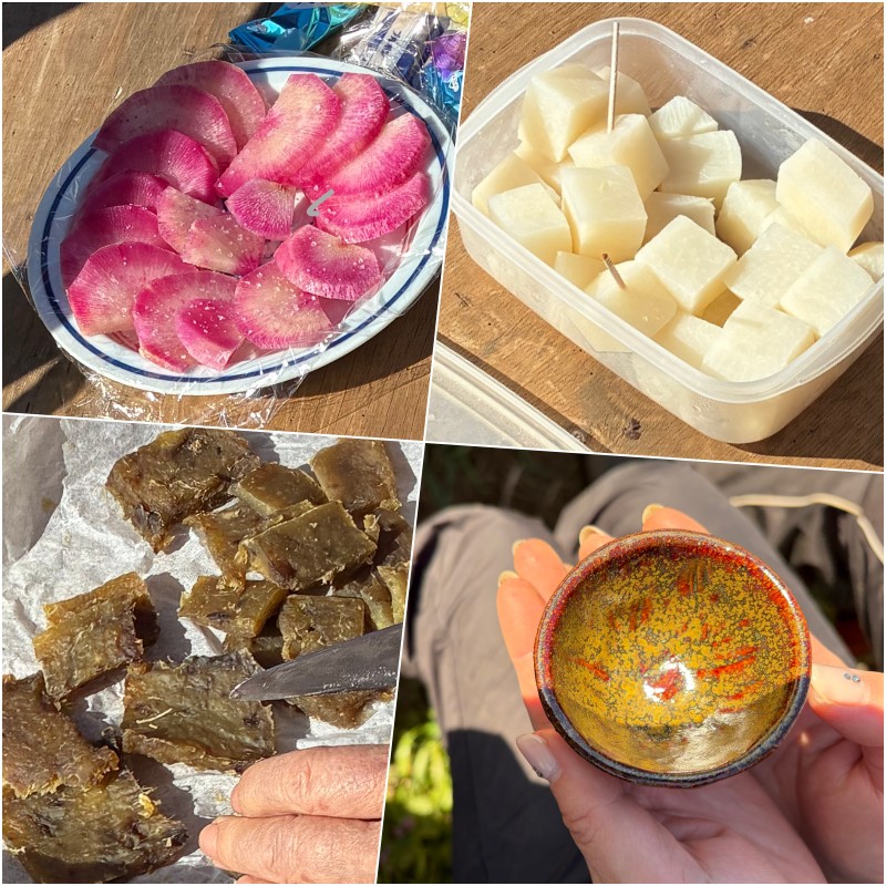 休憩時間に赤かぶ、桜島大根のシンプル茹で。マッシュしたサツマイモを伸ばして日に干した干し芋、手作りのぐい呑み。等の話題が広がりました。