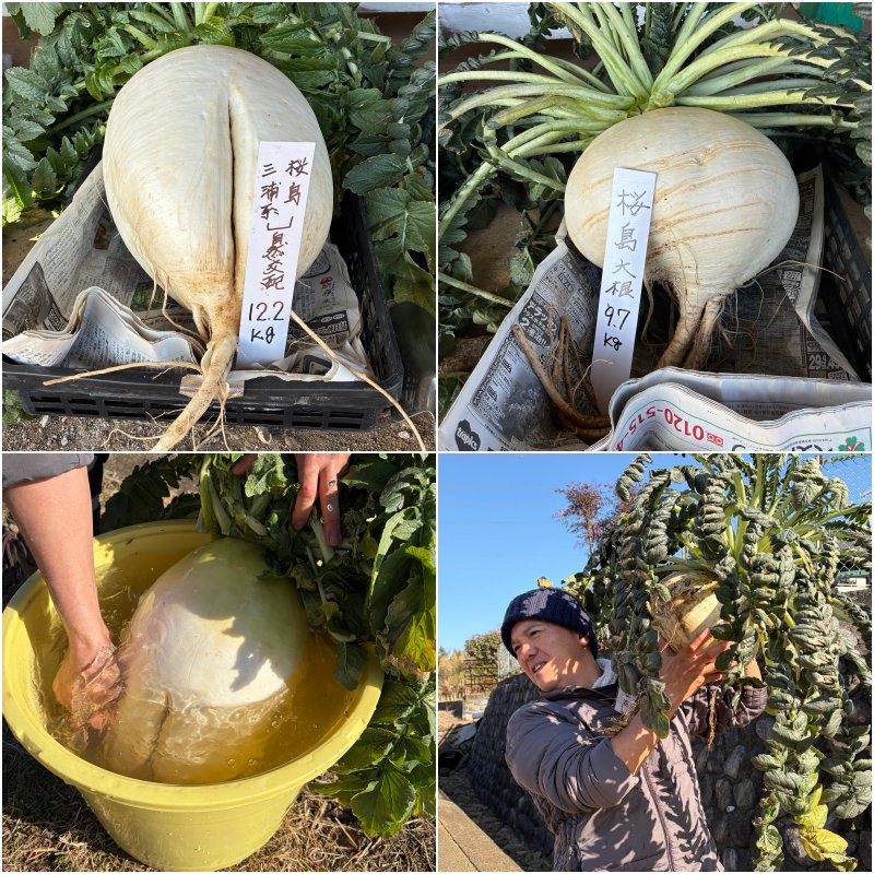 こんなに雨が少なかったのに、桜島大根とハーフ(桜島大根✖️青首大根)大根は10kg級に育ちました。鹿児島の火山灰土で育つ大根の特性でしょうか?すごいでっかさにびっくりです。桜島大根は「トリゴネリン」という物質が普通の大根の60倍と言われているそうで、一日170g 、10日間継続摂取で血管内皮機能が有意に改善という報告があるそうです。(皮ごと食べる方が良い。170gはおでんの大根2個分位)