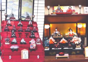 昭和8年のお雛様は女雛が左側にあり日本の伝統的な飾り方となっています。女雛の被る王冠はとても作りの良いものです。