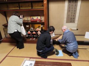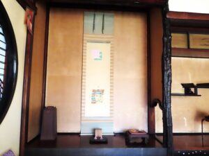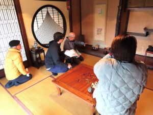 ▼1階の書院の間の床の間では鄭成功(ていせいこう)の掛軸の前で、取材の方が軸の持つ意味を熱心に質問されています。皆様には添付ファイルにてご説明します。