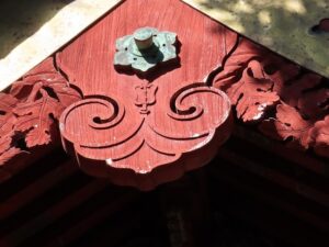 ▼子易明神の懸魚の下に行司マークがあることを参加者が発見されました。ここを何回も紹介しているスタッフも初めての気づきでした。その後の調査でこのマークは神社の宮司をされている鵜川家の家紋であることが判明。しかし何故家紋がこのマークになったのかは継続調査中です。
