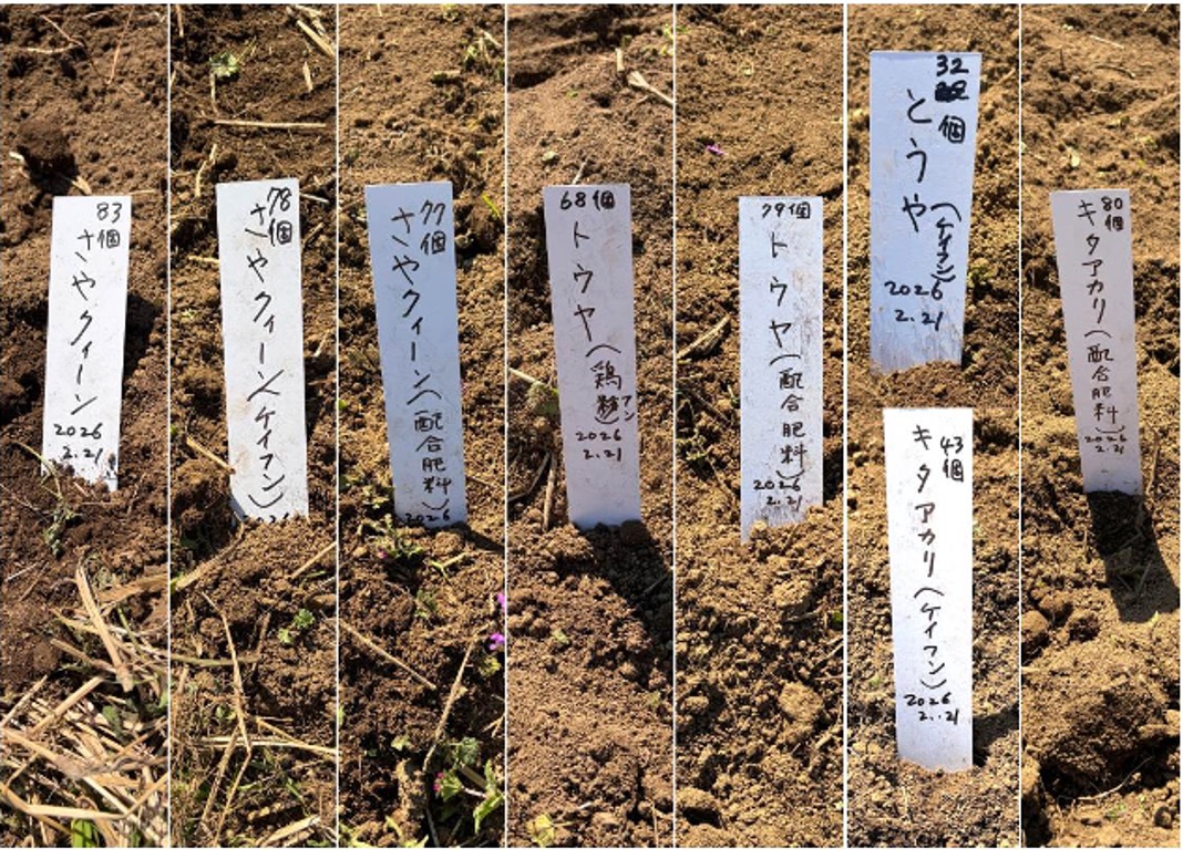 肥料は2種類で、ジャガイモの同一品種にそれぞれ蒔きました。 N(窒素)量が1平方メートル当たり5gになるように測っています。(両肥料ともに窒素量は約5%で計算しています)