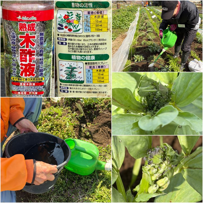 昨年11月よりネットをかけて育てているそら豆にアブラムシが発生しています。即効性は無いようですが、希釈した木酢液をかけてみました。手で握りつぶすのはウィルス感染をさせる危惧があるため避けました。