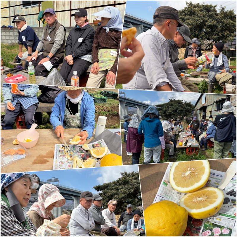 休憩時間は必ず全員で集まります。本日の差し入れはゆずとレモンの交配種モンテローザレモン(ポンテローザ)。重さ1Kgにもなる見事なまでのでっかさと、レモンの形をしていますが酸っぱさは、ほどほどで今後流行りそうな果実です。