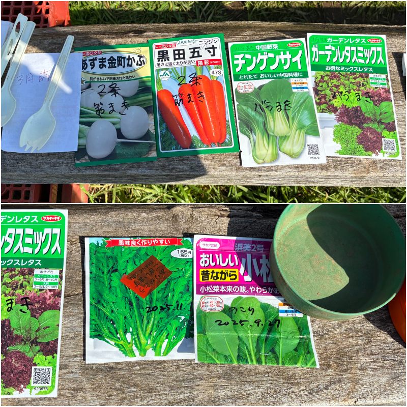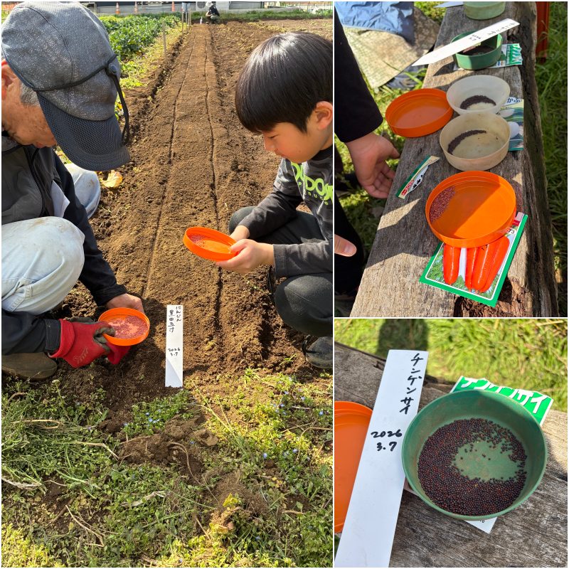 人参の播種をしています。小学生の小さな手の方が種が重ならず真っ直ぐに細い筋に撒けて、ベテランのようでした。