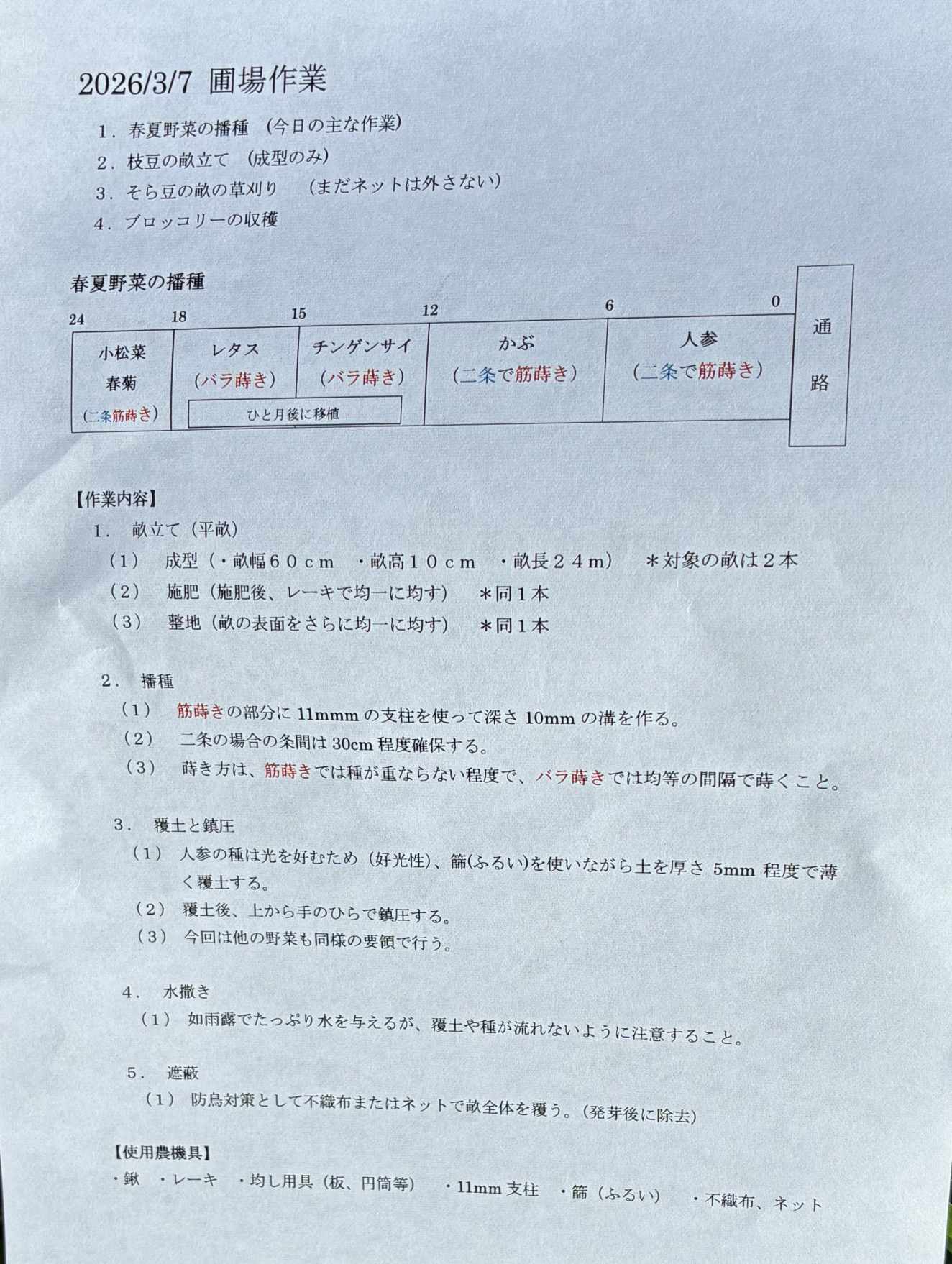 分かりやすい作業案内が配られました。畑作業初心者には大変役立つレジメです。