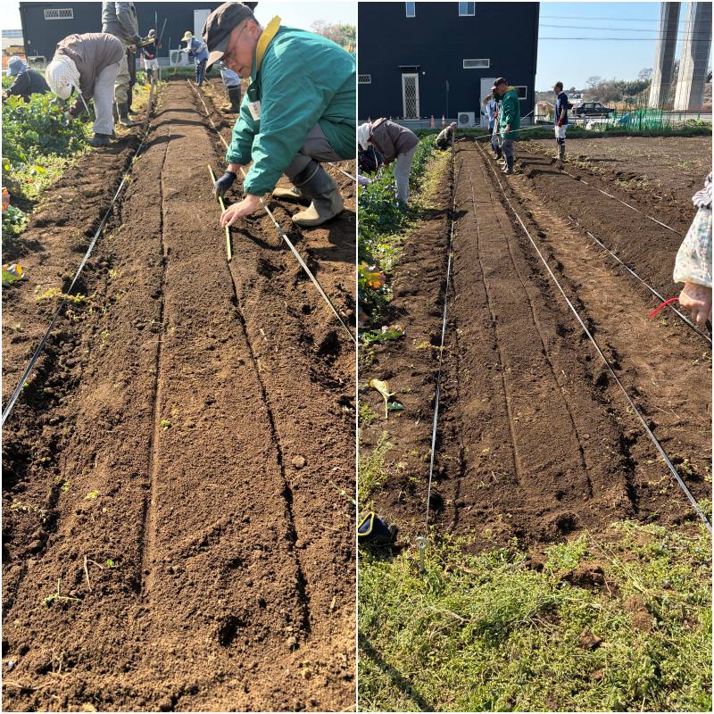 春野菜の種を蒔きます。そのための畝作りの説明を受けています。