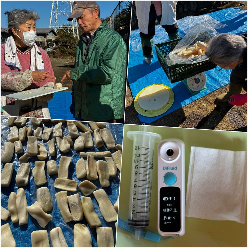 塩漬けにした後の重量を測っています。塩漬け前の大根125Kg が88.4Kgとなり水分36.4Kg減少、生大根の 約3割の水分が抜けていました。塩蔵後約3割水分が抜けると言うデーターはここ数年同じような数値が得られています。