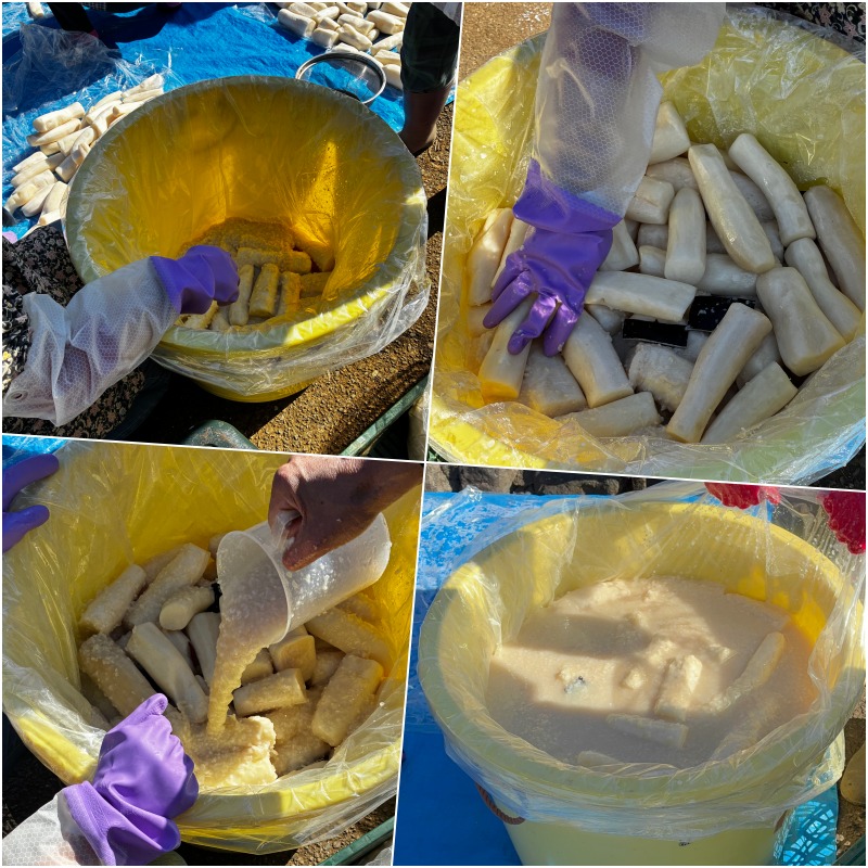 塩抜き後、直射日光に当てて表面を乾かしたのち甘麹と合体させます。作りたての甘麹の糖度は38.9度もありました。1晩寝かせて発酵時間を経過後の糖度を測りましたが測定不能と出てしまいました。2倍希釈に薄めた液を使うのがいいのかもしれません。試す時間がなく続行しました。樽開け時の糖度検査をする予定です。