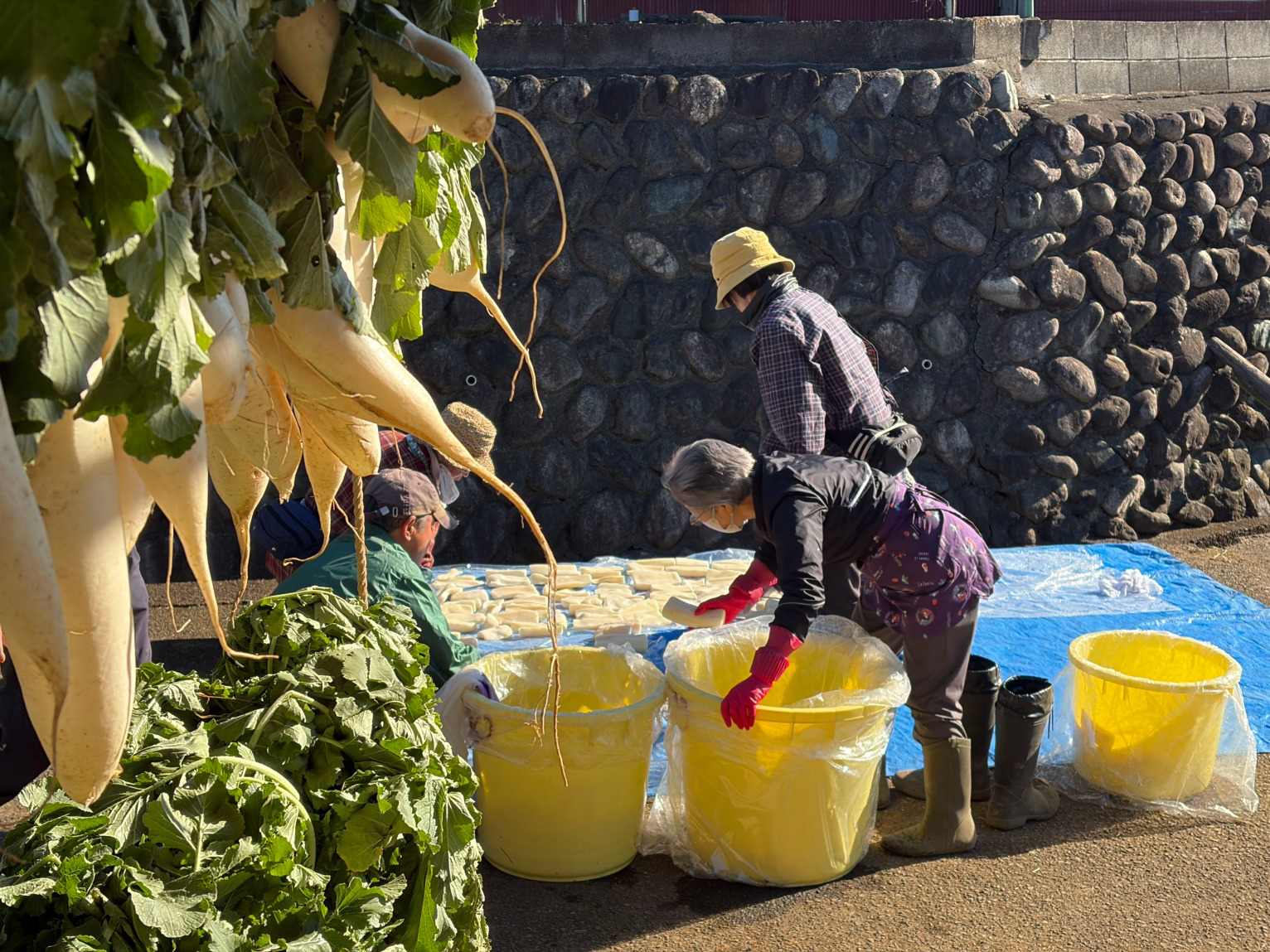 畑では昔ながらの沢庵を漬け込むために「練馬大根」の収穫をしました。