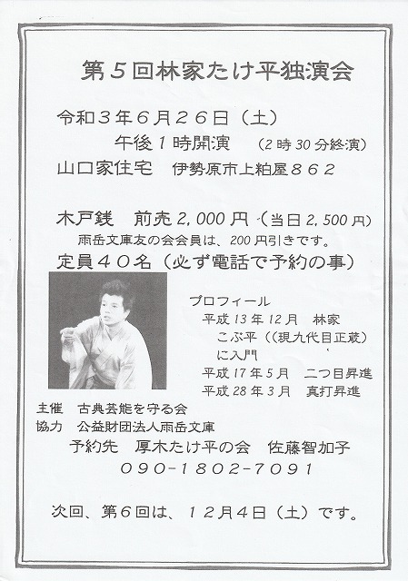 今週末土曜日6/26に雨岳文庫・古民家山口家住宅にて、東海大学出身・真打の林家たけ平師匠による落語独演会が開催されます。コロナ対策のため入場制限を行っていますが、まだ席に余裕があります。師匠の噺を希望される方は下記にご連絡下さい。
