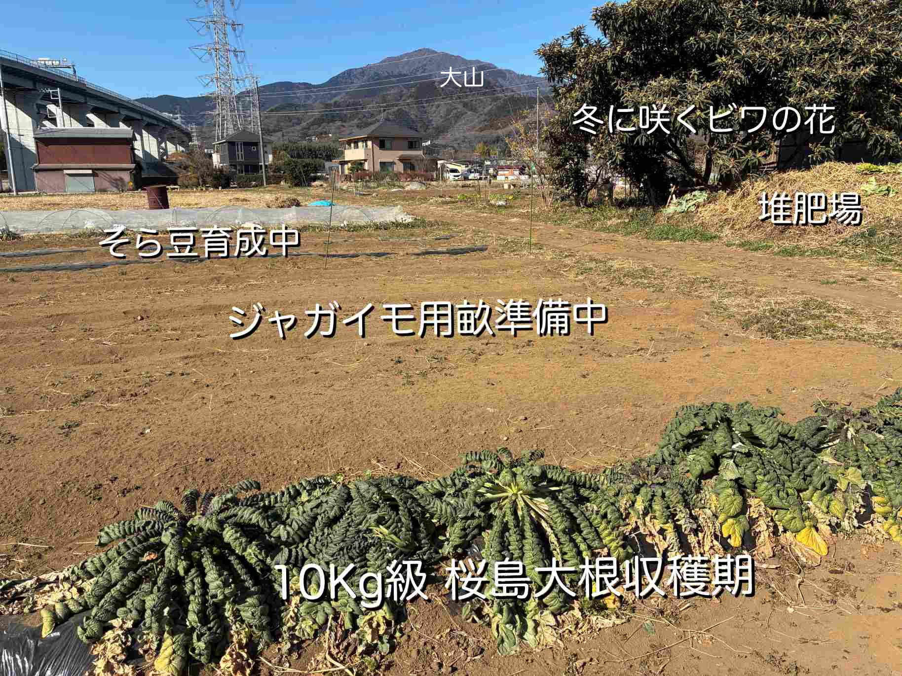 畑は大山の麓です。そら豆は霜除のためシートを被してあります。枇杷の樹は厳寒の今黄色い花が満開です。雨が無く空気が乾燥しているにも関わらず、畑の桜大根は10Kg級に育っています。